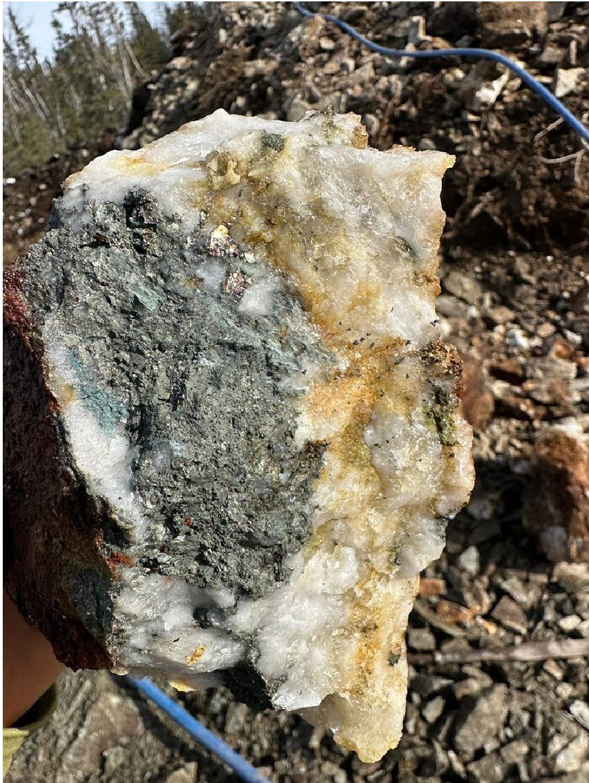 - Directly south of an arsenopyrite-rich quartz vein system with intense alteration; a series of historic gold-silver (“Au-Ag”) showings, grab samples, and drill intercepts have yielded assays up to 14.56 g/t Au and 440 g/t Ag.