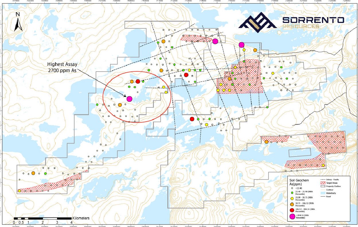 VANCOUVER, BRITISH COLUMBIA, January 18th, 2024–SORRENTO RESOURCES LTD. (the “Company”) (CSE: “SRS”, OCTQB: “SRSLF”) is pleased to announce that it has received analytical results from the fall geochemical sampling program carried out at the Wing Pond Property. In total 274 soil samples were collected across the Property in an approximate 400m x 400m spaced grid. In addition, 27 grab samples were collected over the course of the program.