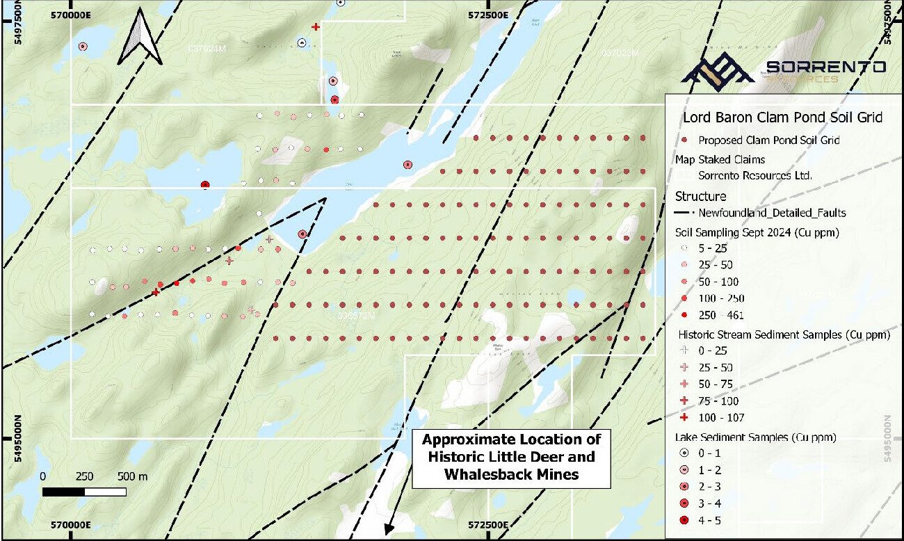 Figure 2. Proposed soil grid over the Clam Pond Target. Historical copper geochemical data displayed along with Sorrento Resources September 2024 soil sampling results.